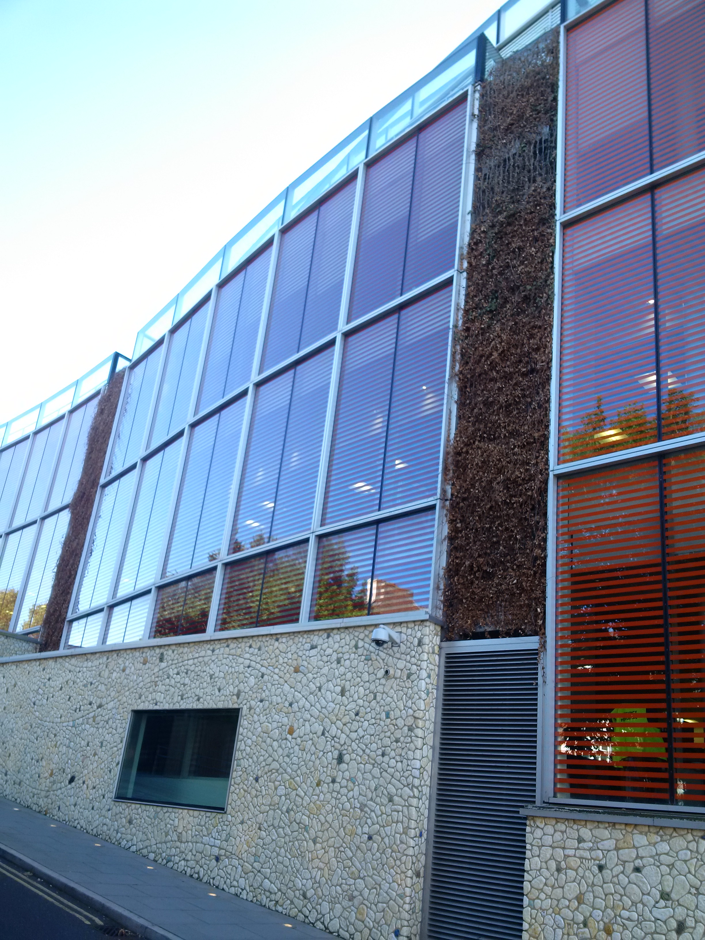 ‘Green walls’ at the back of the building were tokenistic pre-grown ivy stands and have all withered and died, possibly due to a lack of irrigation. Judging by the aerial views you can glimpse if you watch ITV’s new police documentary ‘The Nick’, the small green roof has also died or is dying.